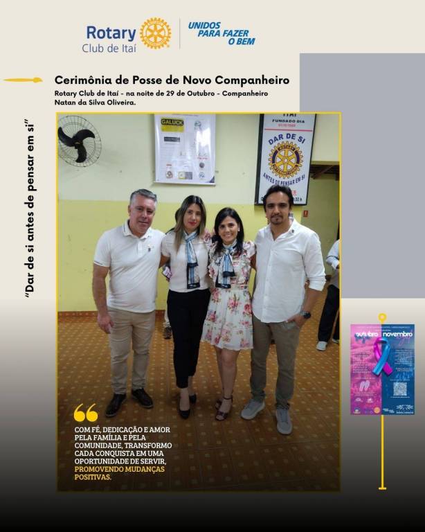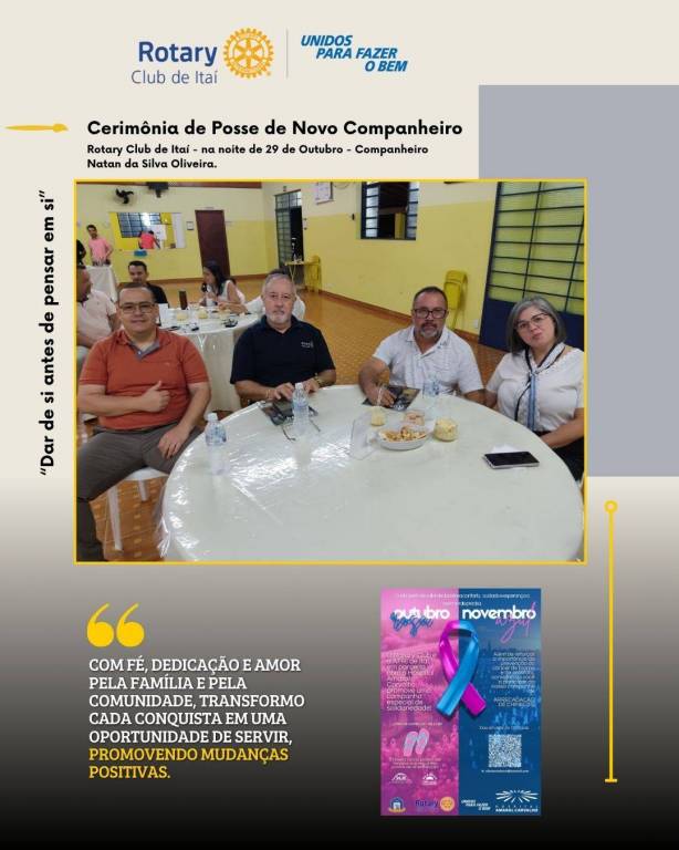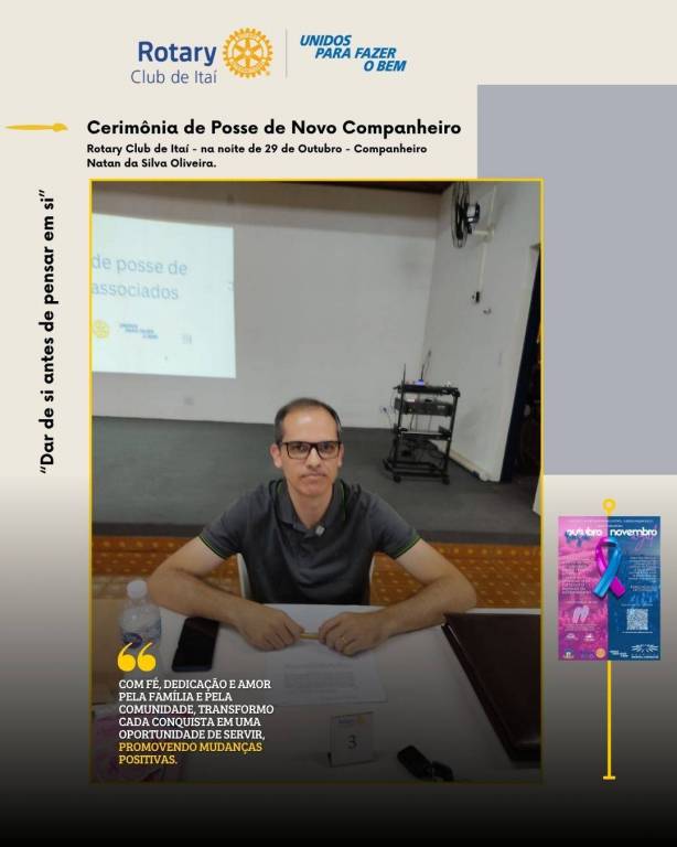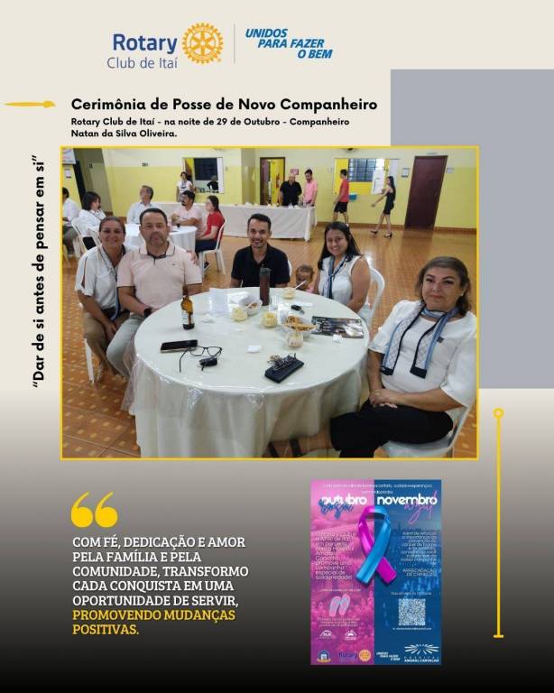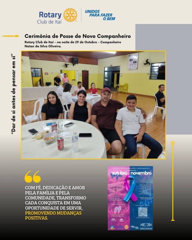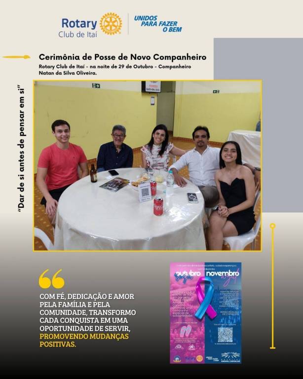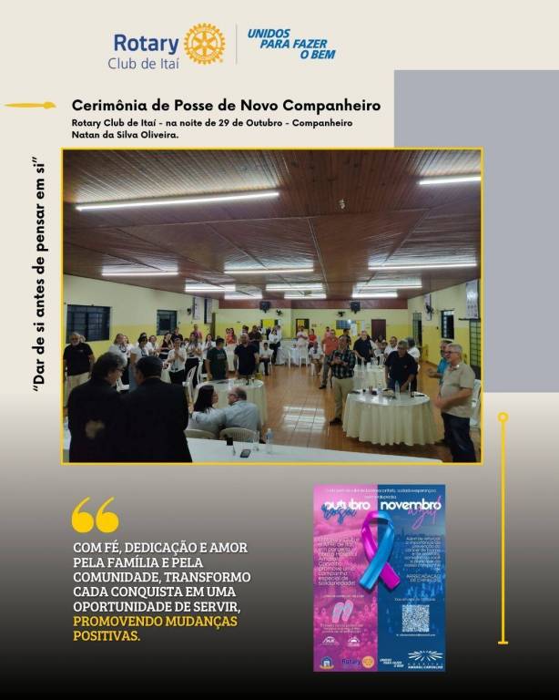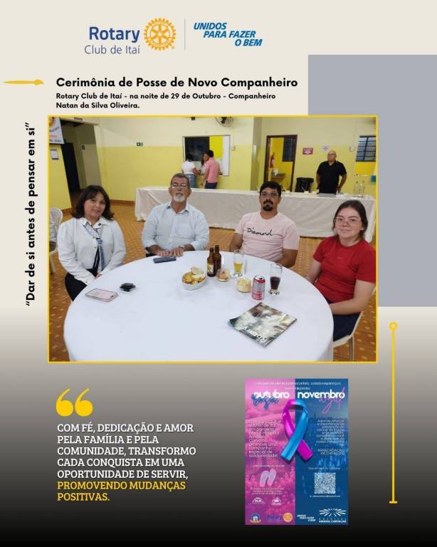Rotary Club de Itaí, na noite de 29 de outubro, realizou uma cerimônia de posse do novo companheiro Natan da Silva Oliveira.