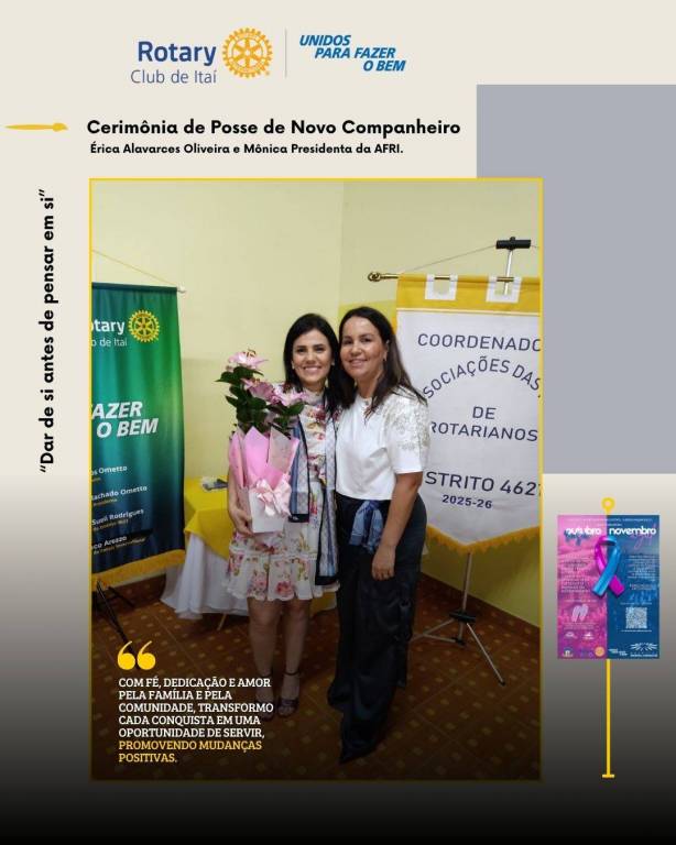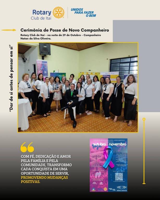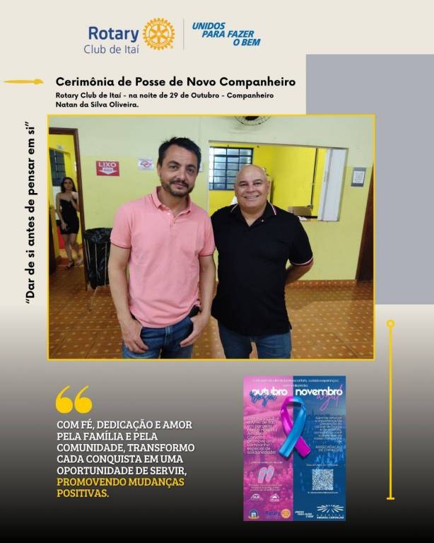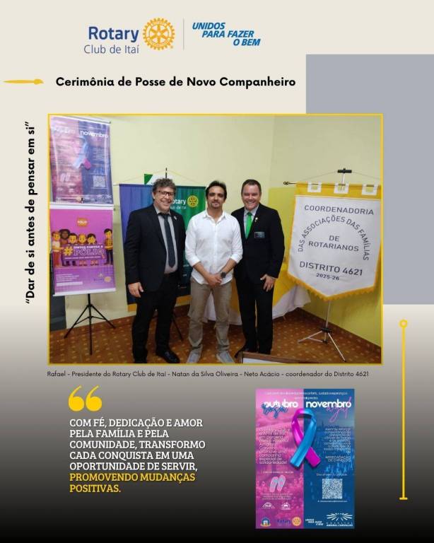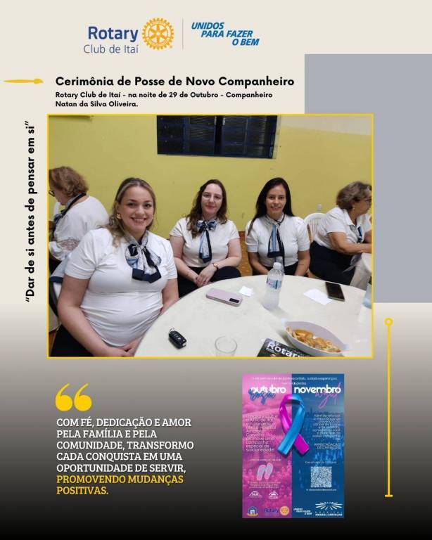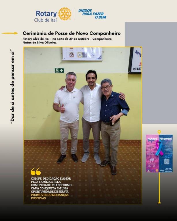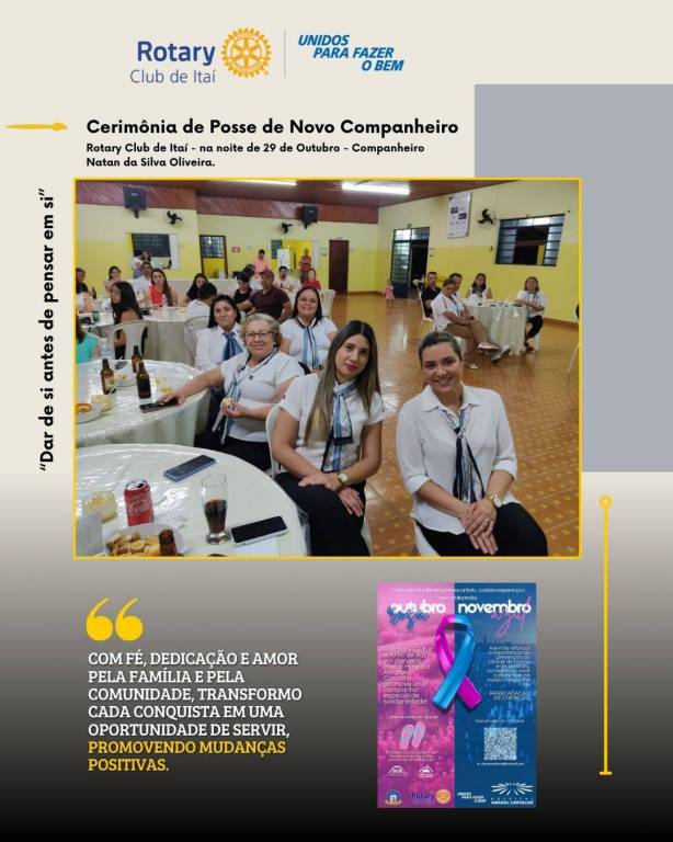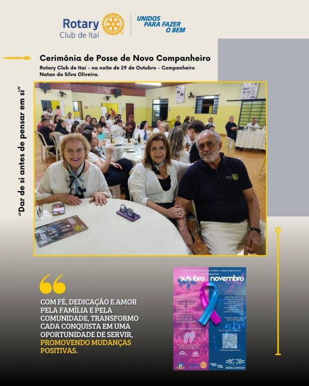 Completam-se agora três anos de dedicação e serviço à comunidade itaiense, com ações que refletem o verdadeiro espírito rotário: fazer o bem e transformar a realidade em um lugar melhor — em Itaí, no Brasil e no mundo.