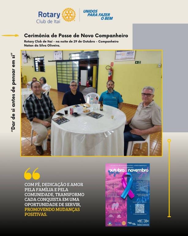 No Rotary, o companheirismo e o ideal de servir nos unem. Acreditamos no valor de “Dar de si antes de pensar em si”, e é com esse propósito que seguimos transformando vidas e comunidades.
