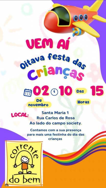 No último domingo (02/11), o Bairro Santa Maria foi tomado por alegria, cores e sorrisos com a realização da 8ª Festa das Crianças, promovida pela Corrente do Bem. Uma ação que, mais uma vez, uniu solidariedade, amor e dedicação para proporcionar um dia inesquecível às famílias da comunidade.