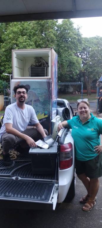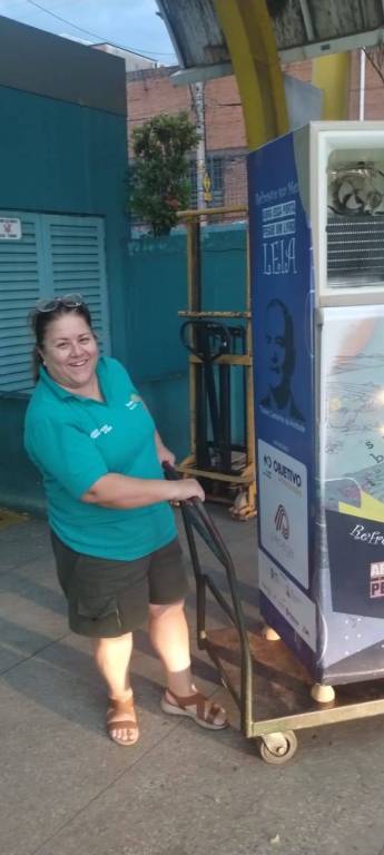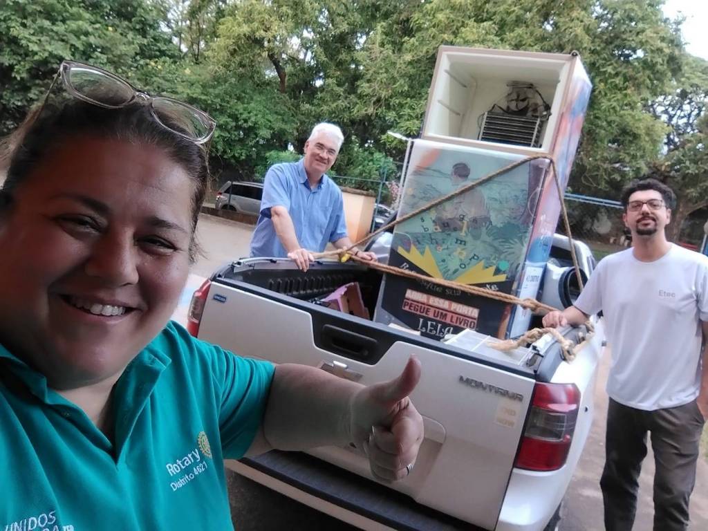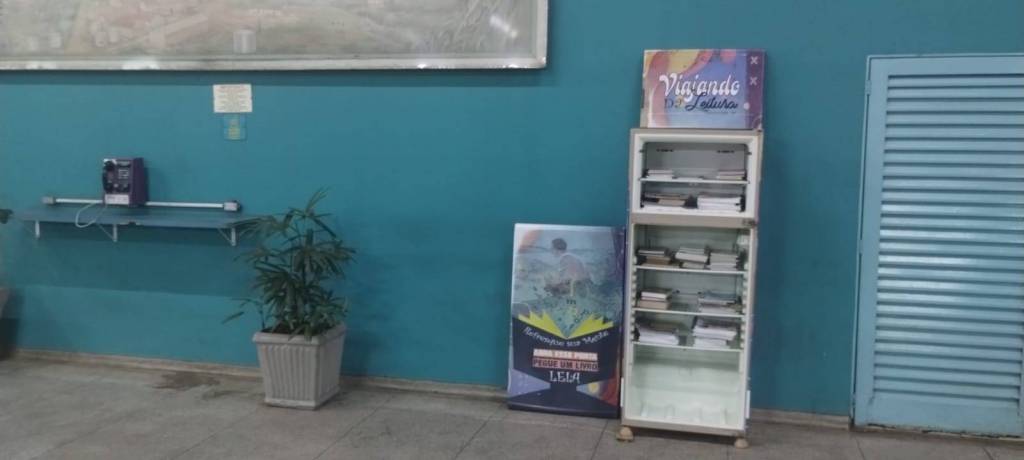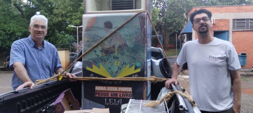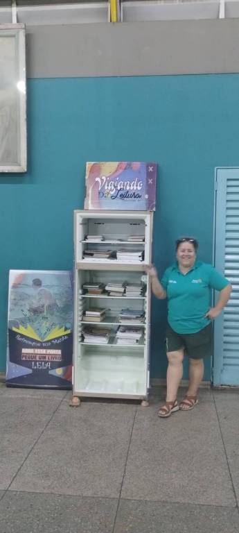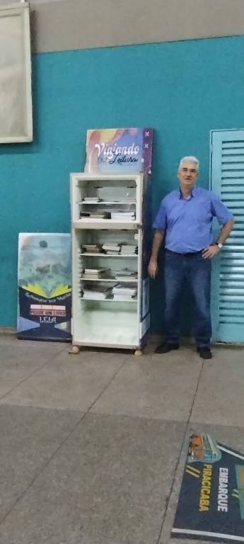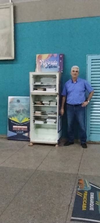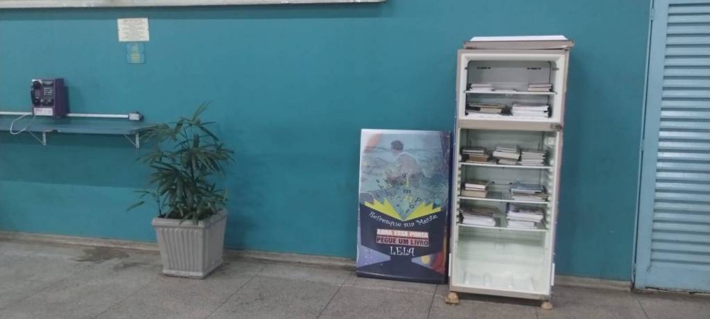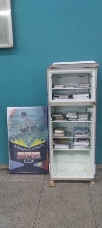GELADEIRA ARRECADADA NA ESCOLA ETEC E DISTRIBUIDA NA RODOVIARIA MUNICIPAL DE PIRACICABA PARA RECOLHIMENTO DE LIVROS PELA POPULAÇÃO LOCAL E COM A RETIRADA PELOS MESMOS.