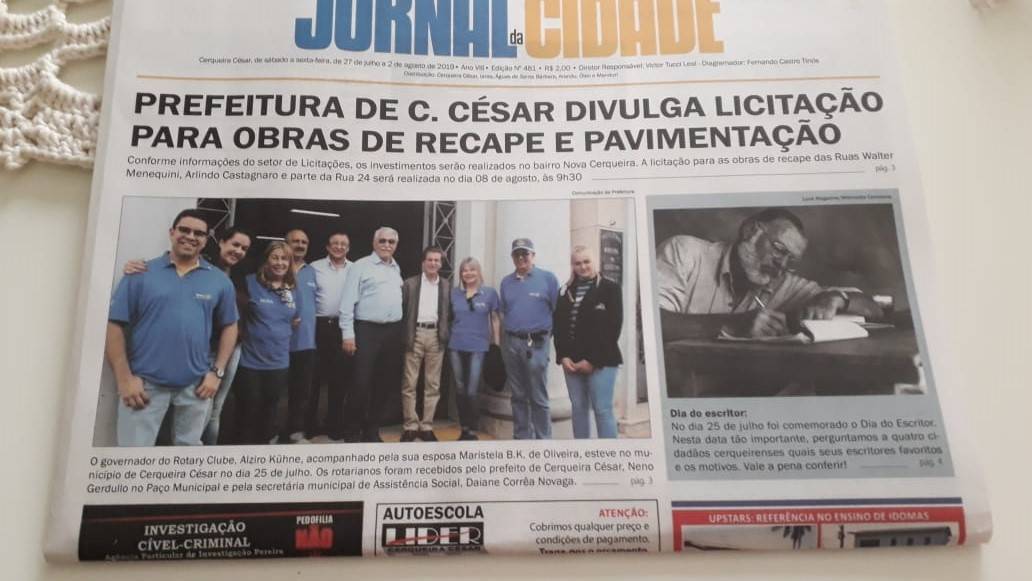 A visita do Governador do Distrito 4621, Alziro Künhe de Oliveira e sua esposa Maristela foi notícia do jornal "A Cidade" na edição de sábado, dia 27/8/19, com foto de capa do jornal.