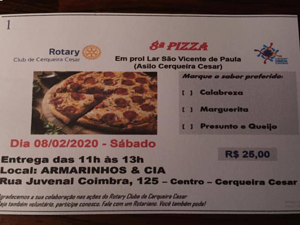 8ª Pizza - em parceria com o Lar São Vicente de Paulo de Cerqueira César. Realização no dia 08 de fevereiro de 2020, das 11 às 13 horas.