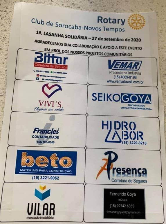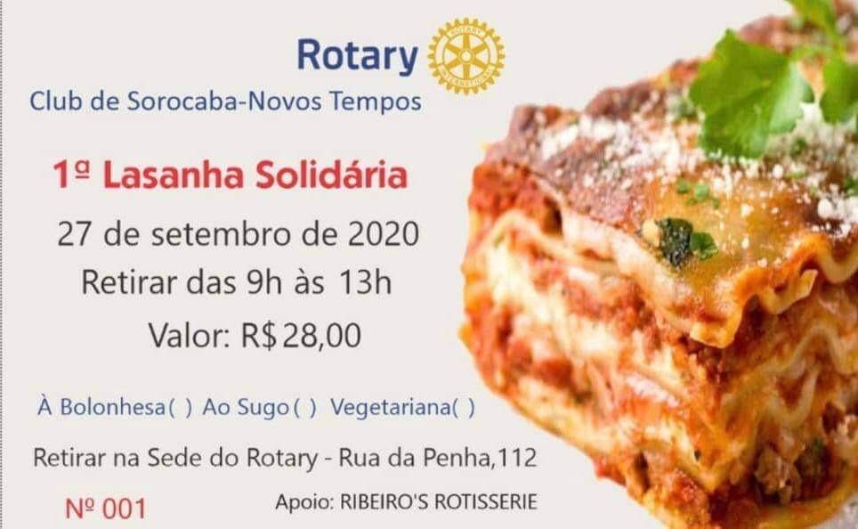 A Lasanha Solidária será um meio de Captação de recursos para nossos projetos, que fazem parte de um Banco de Projetos. tivemos patrocinadores, foram feitas pelo Ribeiros'Rotissieri , as comapnheiras todas com máscaras e adotando o procedimento certo nesta epoca de Pandemia . Foi entregue pelo sistema Drive Tour. 3 tipos de Lasanhas,Bolonhese, ao Sugo e vegetariana. Contamos com voluntários também neste evento.