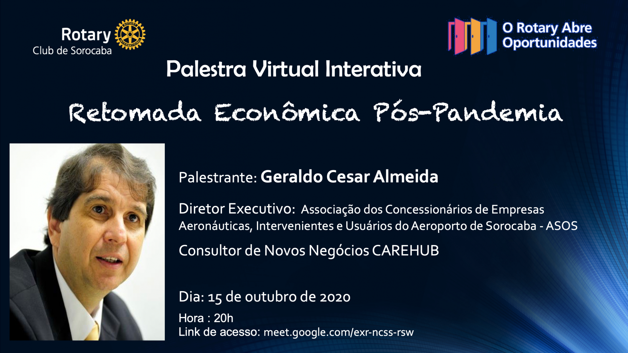 O ciclo de palestras interativas virtuais, patrocinadas pelo Rotary Club de Sorocaba, que ocorre sempre na terceira semana de cada mês terá como tema: Retomada Econômica Pós-Pandemia e será proferida pelo Diretor Executivo da Associação dos Concessionários de Empresas Aeronáuticas, Intervenientes e Usuários do Aeroporto de Sorocaba - ASOS, e Consultor de Novos Negócios da CAREHUB, Sr Geraldo Cesar Almeida. O formato da palestra incentiva a interação entre o palestrante e os participantesde modo que a mensagem possa ser totalmente compreendida. Ela ocorrerá dia 15/10/2020 às 20h00 e pode ser acessada pelo link: meet.google.com/exr-ncss-rsw. Todos estão convidados e serão muito bem vindos!